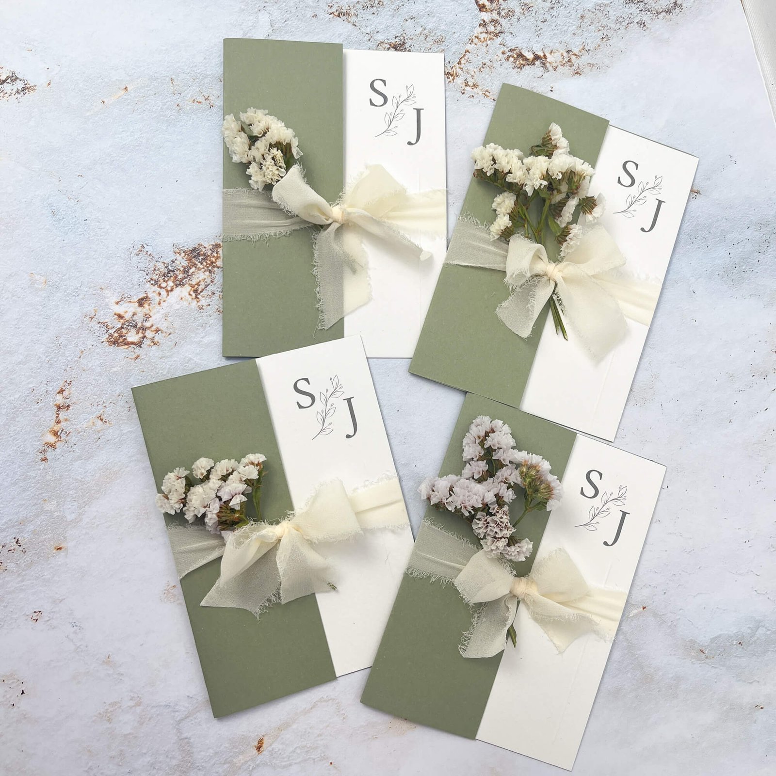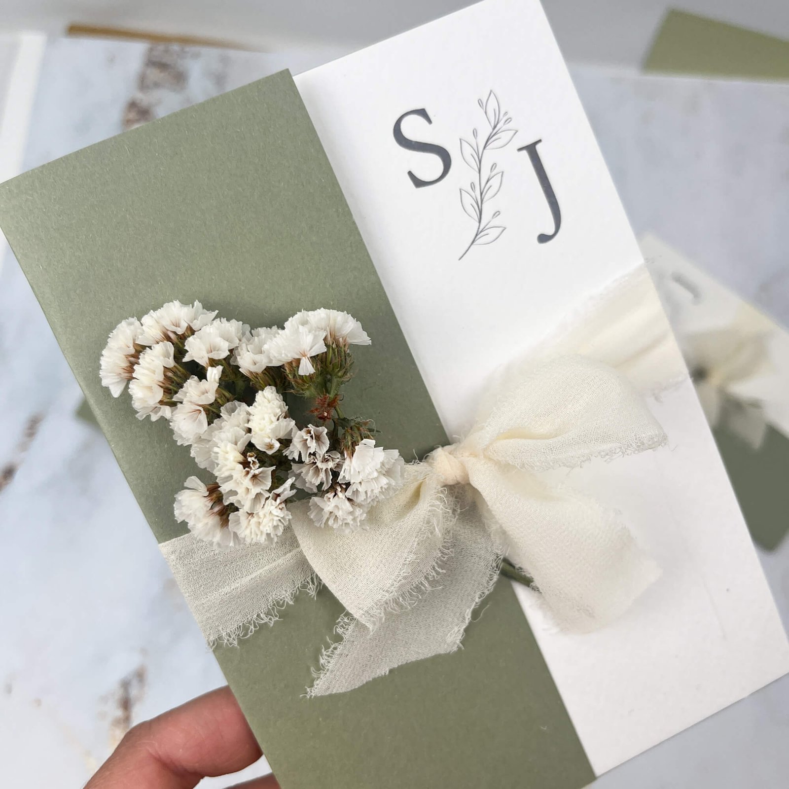 Perfetta per matrimoni dallo stile boho chic, rustico o elegante, questa partecipazione può essere personalizzata con le iniziali degli sposi, il testo dell’invito e dettagli decorativi come un fiocco in chiffon e un piccolo elemento botanico, per un risultato ancora più esclusivo.