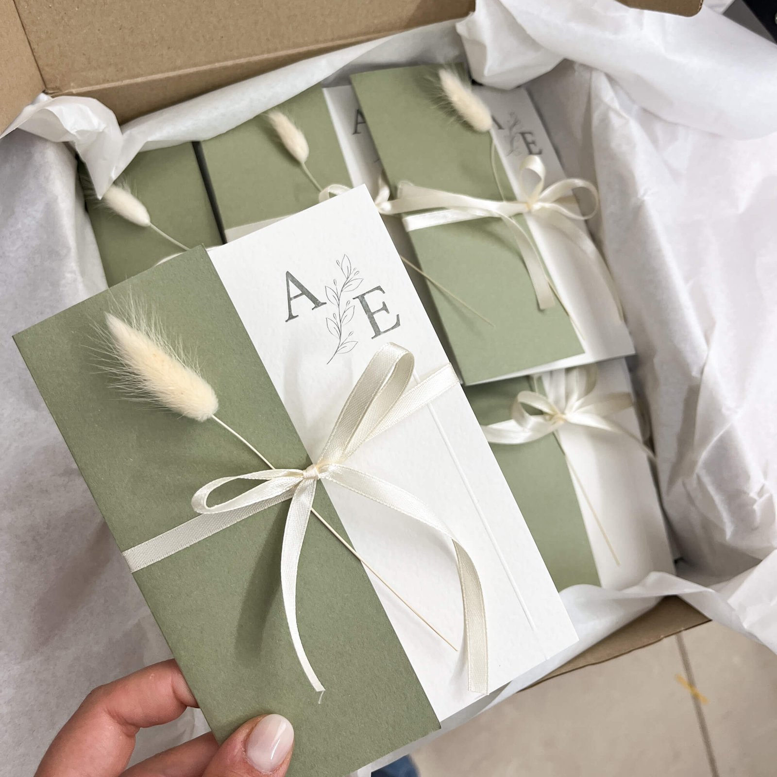 Partecipazione con cartoncino verde salvia e nastro chiffon